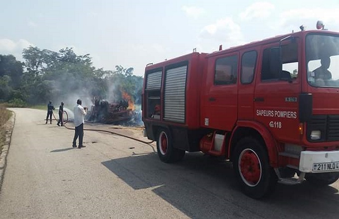 Un gros véhicule transportant des tables-bancs a manqué un virage, s’est renversé et a pris feu ce mercredi après le village Oyembe, sur l’axe routier Owando-Obouya, dans le département de la Cuvette (nord). Bilan : un mort et un blessé grave.