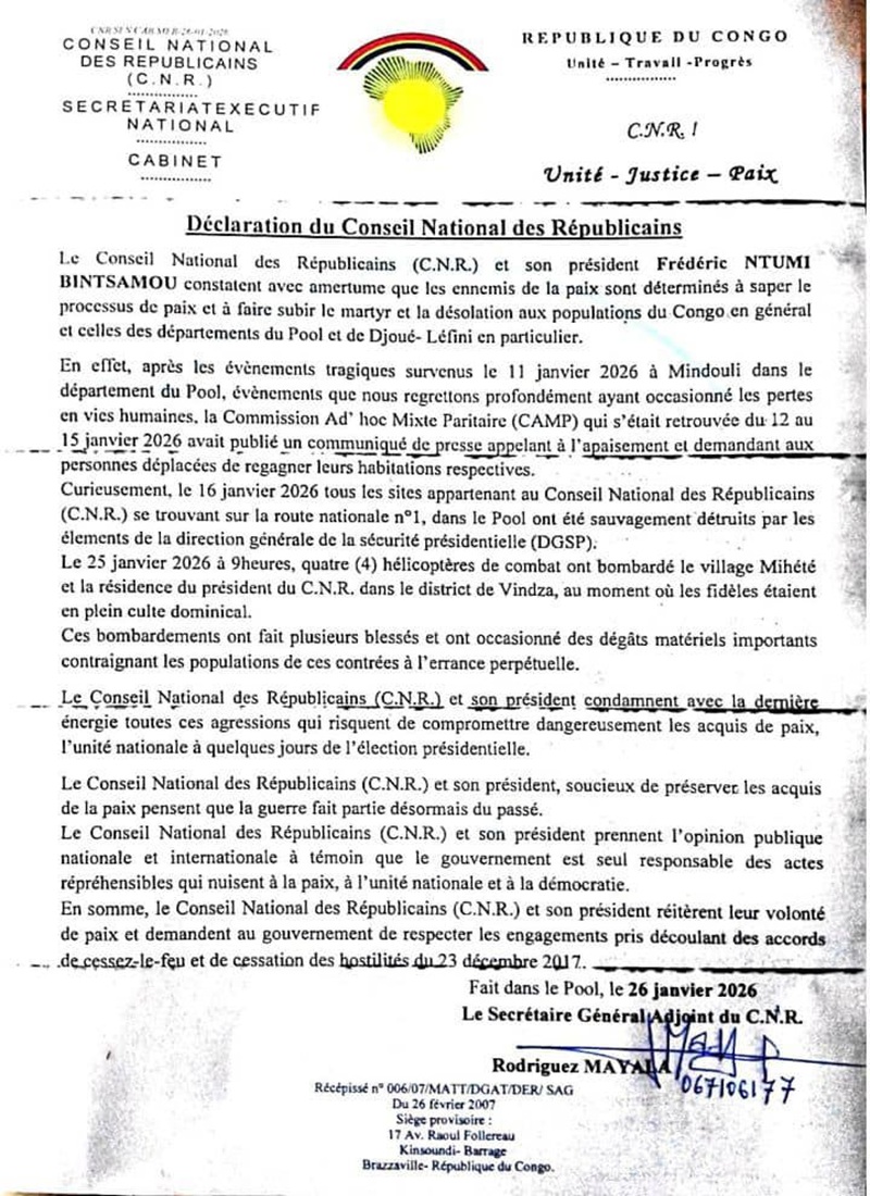 Qu’il soit donc entendu que lorsque le Conseil national des Républicains (CNR) monte au créneau pour dénoncer ce qu’il qualifie de graves atteintes au processus de paix en République du Congo, affirmant que les « ennemis de la paix » seraient déterminés à saboter les acquis obtenus au prix de lourds sacrifices humains, en particulier dans le département du Pool et la zone de Djoué-Léfini, il oubli, ainsi qu’on le dit en lari, « ndoki gâ mâlu mau yé » (le sorcier est en leur sein).