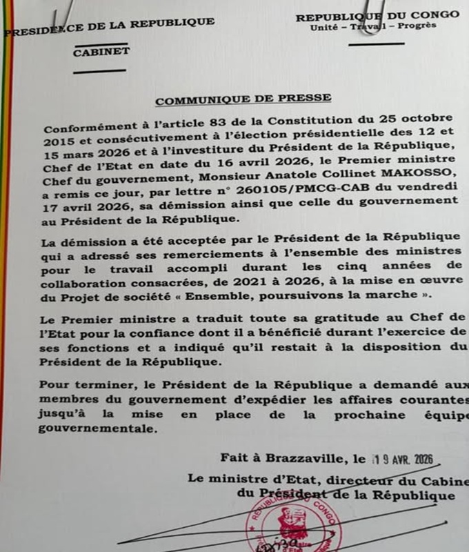 Après l’investiture du Président Denis Sassou N’Guesso, le premier ministre Anatole Collinet Makosso a présenté sa démission au Président de la République, ainsi que celle de l’ensemble de son gouvernement, vendredi 17 avril. Cette procédure est somme-toute naturelle, parce que constitutionnelle. En attendant la mise en place du nouveau gouvernement, le gouvernement Makosso est astreint à évacuer les affaires courantes.