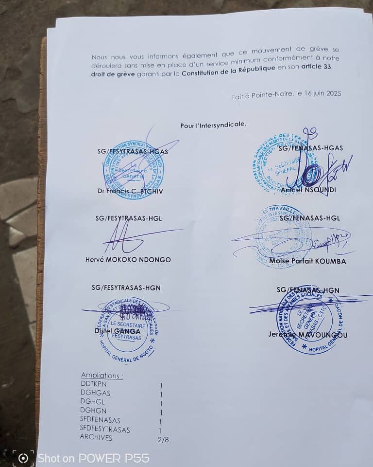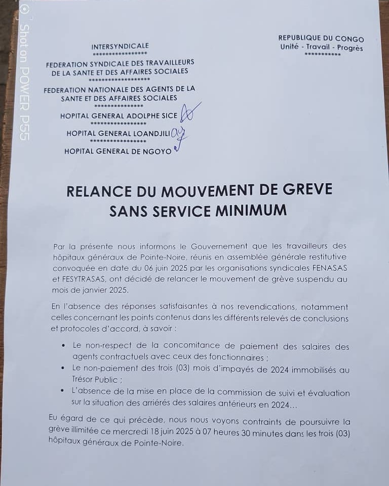 Mieux vaut ne pas tomber malade maintenant à Pointe-Noire, la capitale économique du Congo. Les syndicats de praticiens hospitaliers de la ville océane (Hôpital Général Adolphe Sicé, Hôpital Général Loandjili , Hôpital Général de Ngoyo) ont appelé à débrayer, sans service minimum, ce mercredi 18 juin 2025 à 7h30.