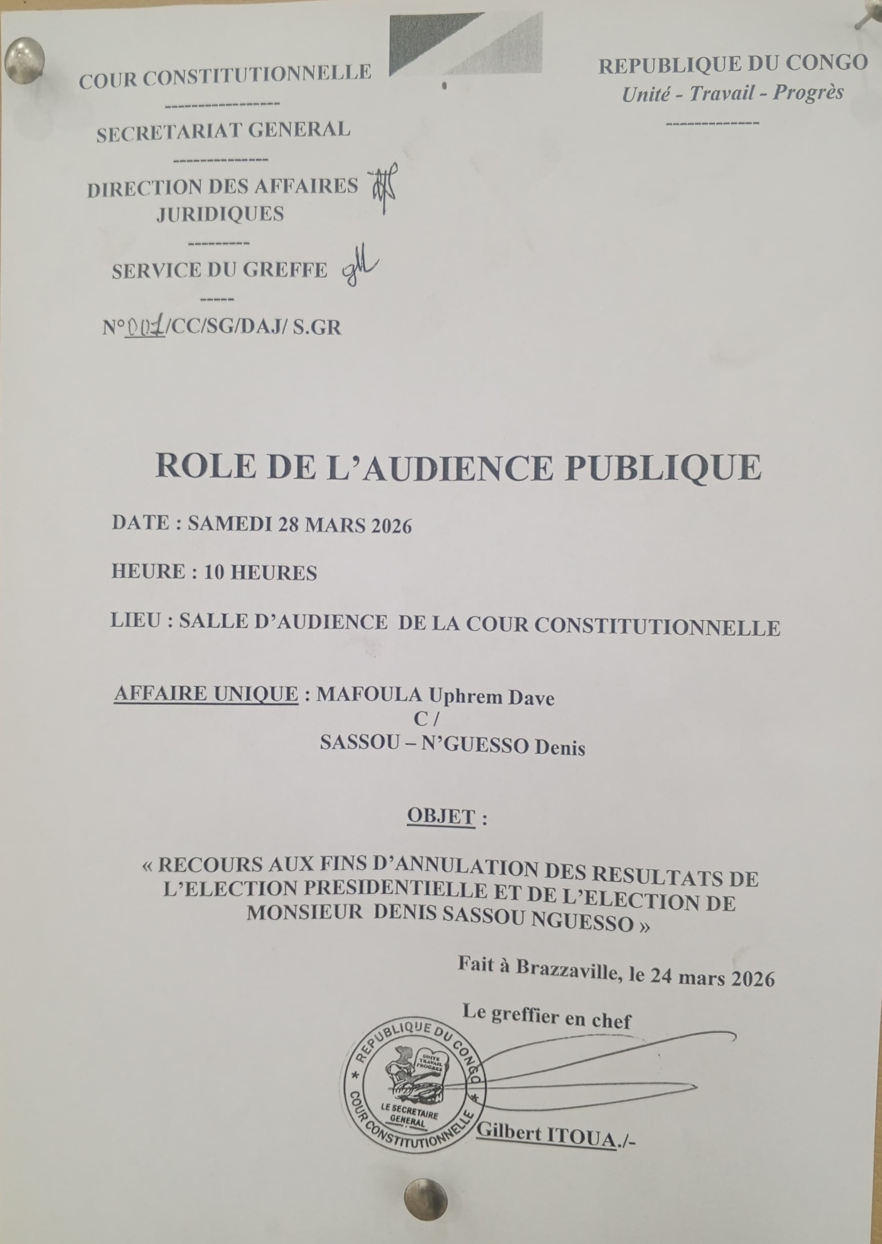 La Cour constitutionnelle sous la direction du président Auguste Iloki annonce une audience publique, ce samedi 28 mars 2026 à 10 heures, dans la salle d’audience de ladite Cour à Brazzaville. Cette audience se réfère à la suite d'un recours introduit par Mafoula Dave Uphrem, en date du 20 mars 2026.
